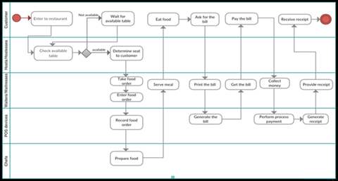 BPMs will be discussed more in your Information Systems class, but we can develop a surface understanding of their usefulness in organizations. Each BPM will have a start point (where the process begins) and an end point (where the process is complete) and may describe different steps for each individual involved. The steps for different individuals may be visually represented in different “lanes,” like in the below BPM for a restaurant process. The customer, host/hostess, waitstaff, chefs, and even the point of sales system are displayed in their lane. Each lane outlines steps of how and when an individual will participate in the entire process.