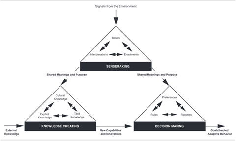 We can think of organizations from an information-based view in which the people in organizations are working with information to accomplish specific outcomes. Information Management scholar Chun Wei Choo created a framework in which these outcomes can be divided into three categories: sense-making, knowledge creation and decision-making.