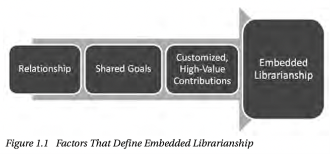 Three main factors define embedded librarianship: ongoing relationships, knowledge of and commitment to shared goals, and customized high-value contributions (Shumaker, 2012b).